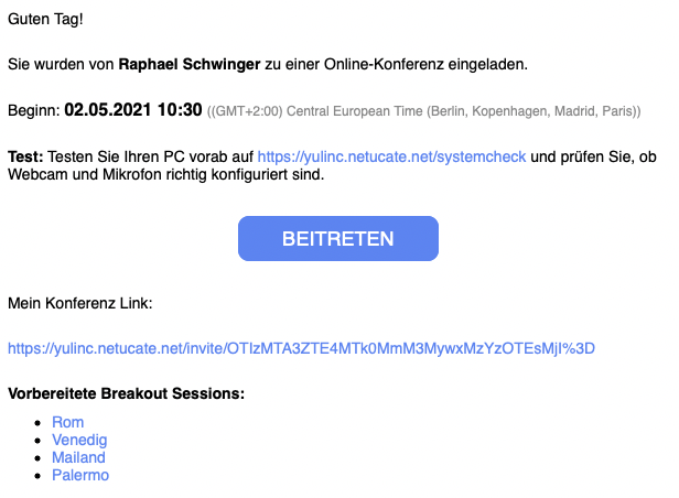 Nach Aktivierung der Gruppenraumfunktion für eine Session können vor dem Start der virtuellen Veranstaltung