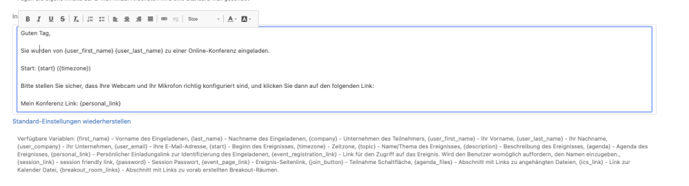 Es wird der Texteditor für Ihre E-Mail geöffnet. Hier können Sie den Text der Standard-E-Mail-Vorlage bearbeiten. Sie können verschiedene Variablen-Platzhalter nutzen. Diese Variablen werden dann für Ihre virtuelle Session mit den relevanten Daten gefüllt.