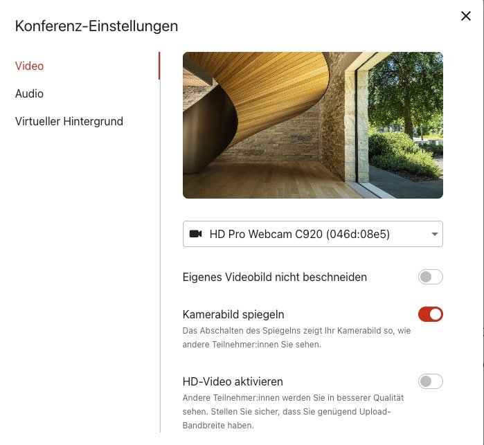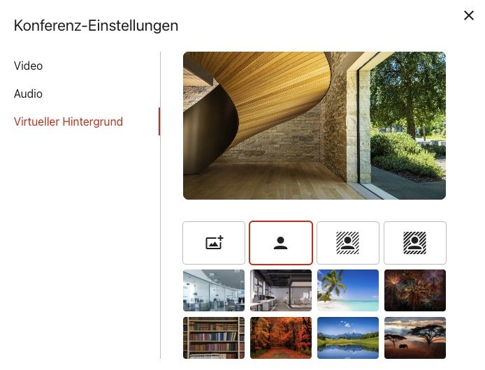 Sofern der Reiter “virtueller Hintergrund” vorhanden ist, können Sie eine Übertragung Ihres Videosignal ansehen: