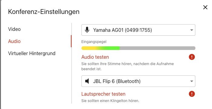 Ist ein Mikrofon angeschlossen, wird die Lautstärke über einen Pegel direkt angezeigt. Klick man auf Audio testen wird 5 Sekunden Ihr Mikrofon aufgezeichnet und dann direkt abgespielt. Sie hören die Aufzeichnung über Ihr ausgewähltes Ausgabegerät.