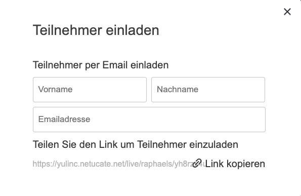 Sie können den Link der Sitzung einfach kopieren (z.B. in Ihr Emailsystem) oder eine Einladungs-E-Mail senden. Hierzu geben Sie Vor-, Nachname und die Mailadresse in das entsprechende Feld und bestätigen dieses.
