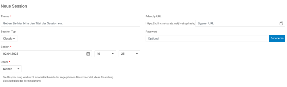 Es öffnet sich ein weiteres Fenster und Sie können die Details für Ihre Session eingeben. Hier können Sie den Namen der Veranstaltung, Startdatum, geschätzte Dauer und ein Passwort eingeben (nicht obligatorisch). Sie können auch eine benutzerfreundliche URL (Link) erstellen, die Sie Ihren Teilnehmern zur Verfügung stellen.
