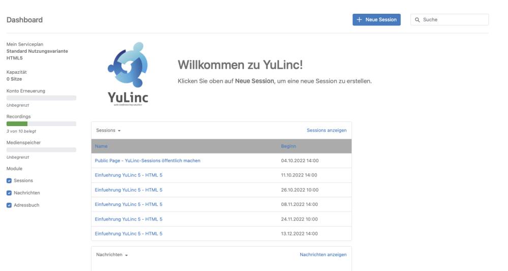 Um eine neue Session zu erstellen, klicken Sie auf die Schaltfläche Neue Session auf Ihrem Dashboard im YuLinc-Mandanten.