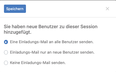 Unmittelbar nachdem Sie auf Speichern geklickt haben, erscheint eine Popup-Bestätigungsnachricht und fragt, ob Sie Einladungs-E-Mails versenden möchten. Wenn Sie dies wünschen, klicken Sie auf das entsprechende Optionsfeld und dann auf den Button Speichern.