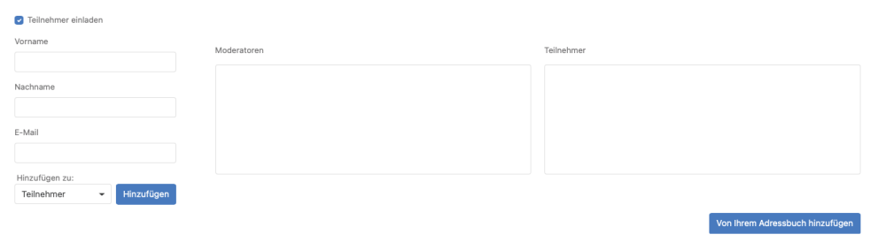 Bitte beachten Sie, dass Sie nach dem Erstellen der Veranstaltung E-Mail-Einladungen an Ihre Kontakte senden können, indem Sie auf Teilnehmer einladen klicken, es werden dann weitere Optionen angezeigt. Hier können Sie den Namen eingeben, der in der Sitzung für jeden Teilnehmer angezeigt werden soll, sowie deren Rolle festlegen. Sobald Sie neue Teilnehmer hinzugefügt haben, klicken Sie auf die Schaltfläche Speichern.