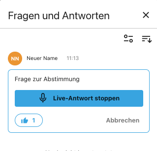 2) durch die Aktivierung “wird live beantwortet” sichtbar einblenden und direkt per Audio beantworten: