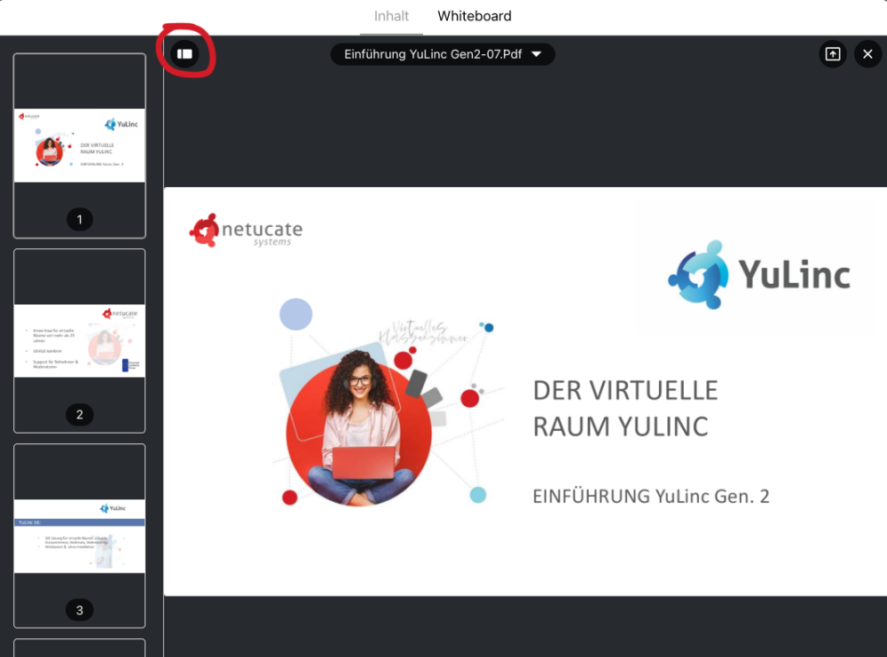 Bei mehrseitigen Präsentationen (z.B. PPTX, PDFs) kann die Thumbnail-Funktion eingeschaltet werden. Diese Funktion erlaubt dem Präsentierenden die Vorschau aller Seiten auf der linken Seiten inkl. der direkten Navigation auf die gewünschte Seite.