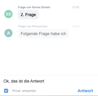Klickt die Moderation “Privat antworten” an, dann sieht nur derjenige Teilnehmer die Antwort, der die Frage gestellt hat. Ansonsten wird die Antwort allen eingeblendet.