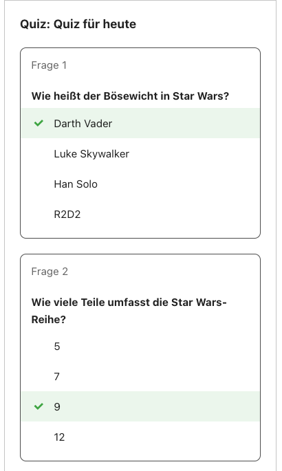 Hinterlegen Sie bei der Frage direkt die richtige Antwort (es können auch mehrere Antworten als richtig markiert werden).