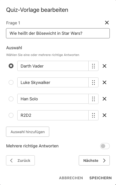 Der Unterschied zur Umfrage: es können mehrere Fragen in einem Quiz hinterlegt werden, die die Teilnehmer dann hintereinander durcharbeiten.