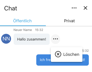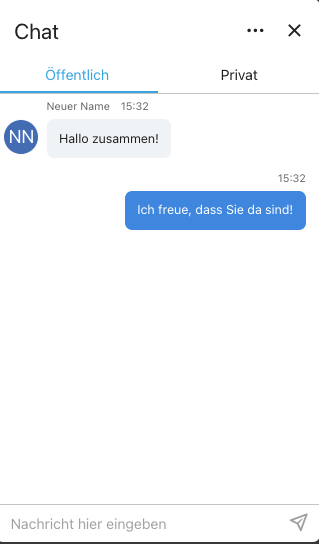 Mit der Chat-Funktion können Textnachrichten an alle Teilnehmer (öffentlicher Chat) gesendet werden. Darüber hinaus gibt es einen Moderatoren-Chat und einen Privat-Chat (1:1-Chat). Den Chat öffnet man über das Symbol: