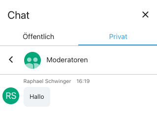 Den Moderatoren-Chat wählen Sie ebenfalls über den Reiter “Privat” aus und können sich dann mit allen anwesenden Moderatoren austauschen: