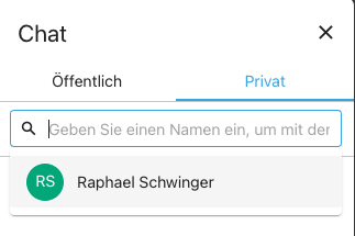 Beim privaten Chat wählen Sie den entsprechenden Reiter aus und wählen den Teilnehmer aus, der Ihre Nachricht erhalten soll:
