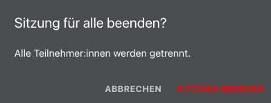 Mit der Beendigung des Session werden auch Textnachrichten und Umfrage-Ergebnisse u.a. gelöscht. Hier wird vorher noch ein Hinweis eingeblendet: